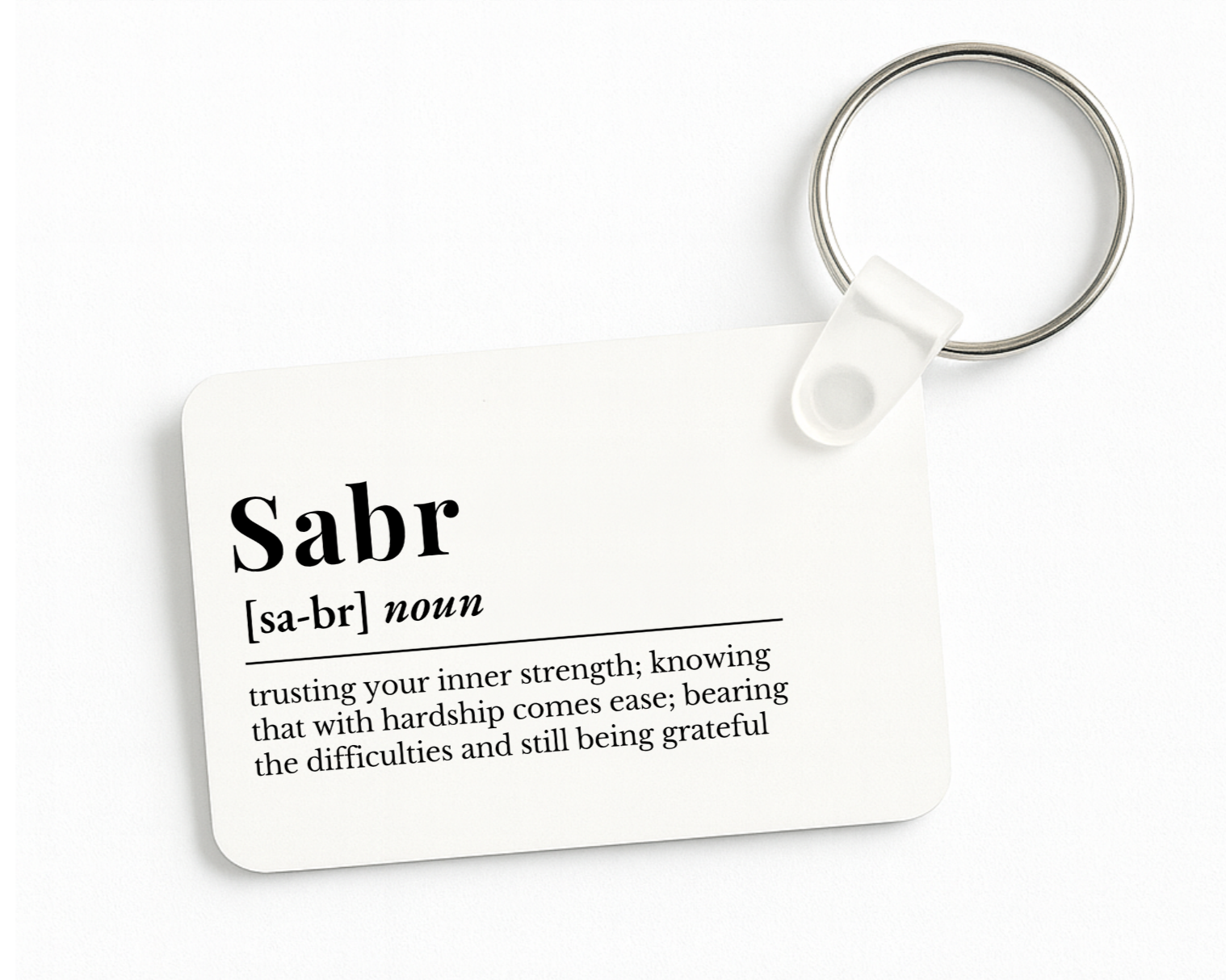 This double-sided keychain (2.3″ × 1.57″, thickness 0.12″) features the word Sabr — defined as trusting your inner strength, bearing difficulties with patience, and remaining grateful through hardship. With its minimalist black-and-white design, it is a timeless reminder of resilience and faith.