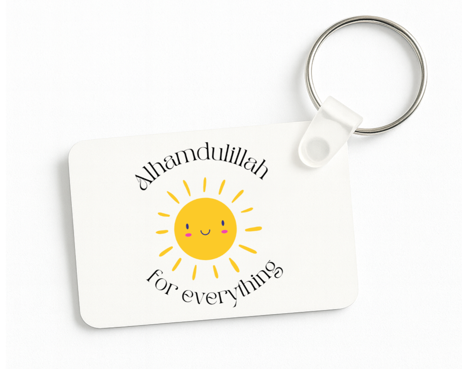 This cheerful double-sided keychain (2.3″ × 1.57″, thickness 0.12″) features the phrase “Alhamdulillah for everything” with a bright, smiling sun illustration. Playful yet meaningful, it’s a daily reminder to carry gratitude and positivity wherever you go.