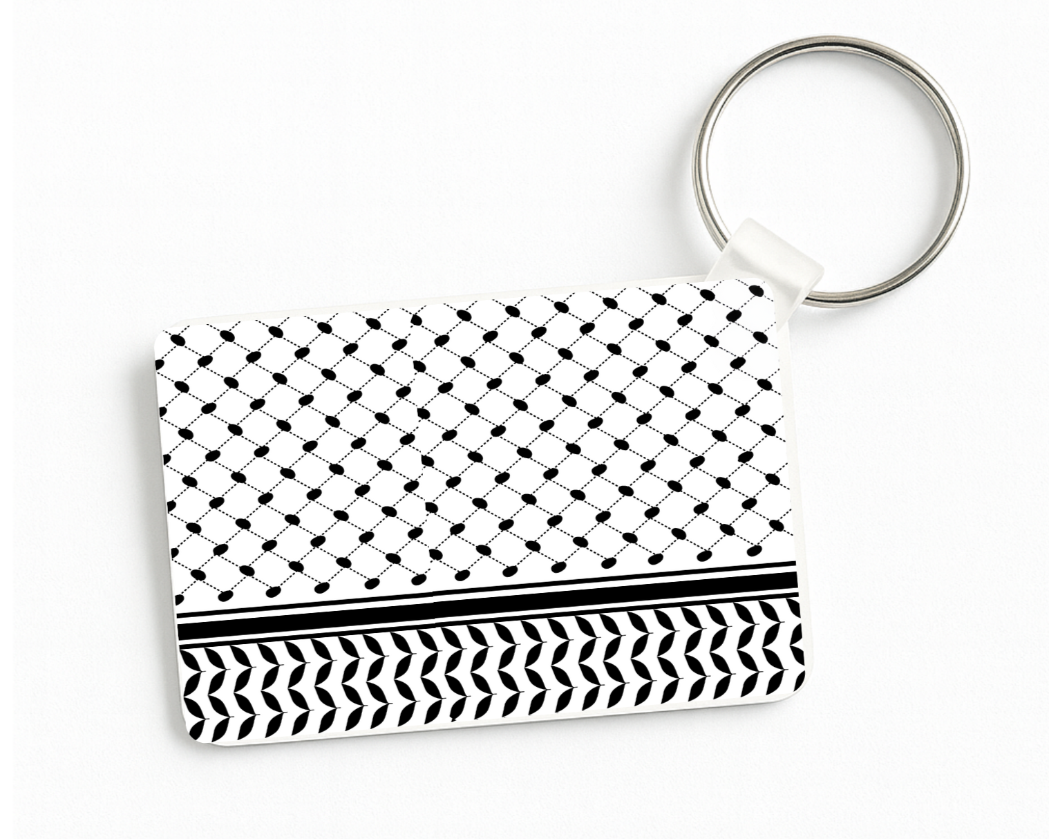 Sophisticated and symbolic, this double-sided keychain (2.3″ × 1.57″, thickness 0.12″) features the traditional black-and-white Keffiyeh pattern — a timeless emblem of heritage, identity, and resilience. Its bold geometric design makes it both meaningful and stylish.