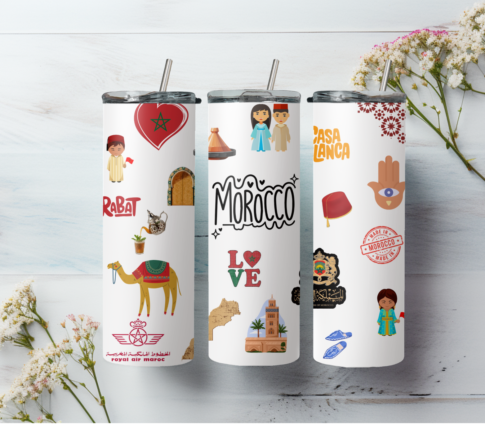 Experience the charm, history, and vibrant spirit of Morocco with our beautifully curated Cultural Collection tumbler. Thoughtfully designed to capture the essence of Moroccan heritage, this 20oz stainless steel tumbler features iconic symbols, traditional patterns, and beloved cultural elements—from the ancient streets of Rabat to the warmth of Marrakech and the energy of Casablanca.